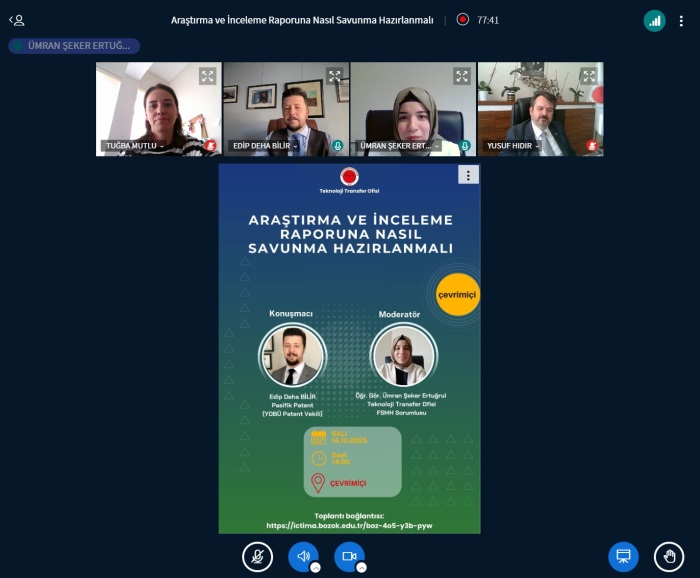 Koordinatörlüğümüz Fikri Sınai ve Mülkiyet Hakları Modülü kapsamında YOBÜ Patent Vekili Edip Deha BİLİR'in konuşmacı olduğu "Araştırma ve İnceleme Raporuna Nasıl Savunma Hazırlanmalı" isimli etkinlik çevrimiçi olarak 14 Ekim 2025 tarihinde öğretim elemanlarımız ve öğrencilerimizin katılımıyla gerçekleştirilmiştir. Etkinlik kaydına erişmek için tıklayınız.