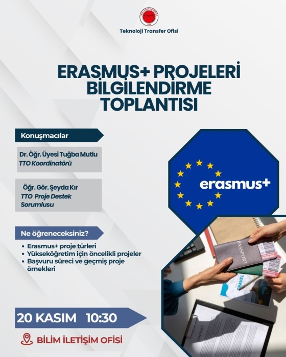 TTO olarak düzenlediğimiz "ERASMUS+ PROJELERİ BİLGİLENDİRME TOPLANTISI" isimli etkinliğimiz 20 Kasım günü saat 10:30'da Bilim İletişim Ofisi salonunda gerçekleştirilecektir. Erasmus+ projeleri konusunda ilgili olan tüm akademisyenlerimizi bekliyoruz.