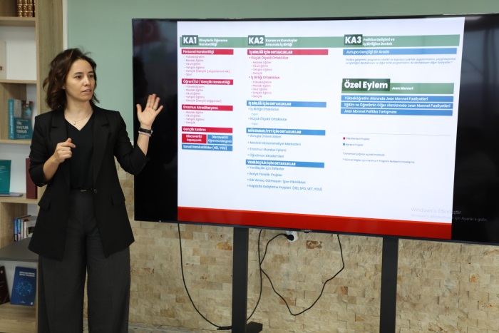 Koordinatörlüğümüz tarafından, öğrenciler ve akademisyenlerin Erasmus+ programı kapsamında sunulan uluslararası eğitim, staj ve proje fırsatları hakkında bilgilendirilmesi, proje kültürünün geliştirilmesi ve başvuru süreçlerine yönelik farkındalık oluşturulması amacıyla “Erasmus+ Projeleri Bilgilendirme Toplantısı” düzenlendi. Bozok Bilim İletişimi Ofisi’nde düzenlenen toplantıya akademisyenler ve çok sayıda öğrenci katıldı. Toplantıda TTO Koordinatörümüz Dr. Öğr. Üyesi Tuğba MUTLU ve TTO Proje Destek Sorumlumuz Öğr. Gör. Şeyda KIR tarafından Erasmus+ proje türleri, yükseköğretim için öncelikli tematik alanlar, proje başvuru süreçleri, değerlendirme kriterleri ve daha önce yürütülmüş başarılı proje örnekleri hakkında bilgiler paylaşıldı. Ayrıca proje yazımında dikkat edilmesi gereken noktalar, uluslararası ortak bulma yöntemleri ve Erasmus+ programının sunduğu finansman destekleri de ele alındı.