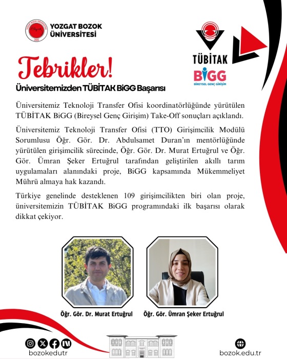 Üniversitemiz Teknoloji Transfer Ofisi Koordinatörlüğünde yürütülen TÜBİTAK BiGG (Bireysel Gençlik Girişim) Take-Off sonuçları açıklandı. Üniversitemiz Teknoloji Transfer Ofisi Girişimcilik Modülü Sorumlusu Öğr. Gör. Dr. Abdulsamet DURAN’ın mentörlüğünde yürütülen girişimcilik sürecinde, Yozgat Meslek Yüksekokulu Öğretim Elemanı Öğr. Gör. Dr. Murat ERTUĞRUL ve Teknoloji Transfer Ofisi Fikri Sınai ve Mülkiyet Hakları Modül Sorumlusu Öğr. Gör. Ümran ŞEKER ERTUĞRUL tarafından geliştirilen akıllı tarım uygulamaları alanındaki proje, BiGG kapsamında Mükemmeliyet Mührü almaya hak kazandı. Türkiye genelinde desteklenen 109 girişimcilikten biri olan proje, üniversitemizin TÜBİTAK BiGG programındaki ilk başarısı olarak dikkat çekiyor.